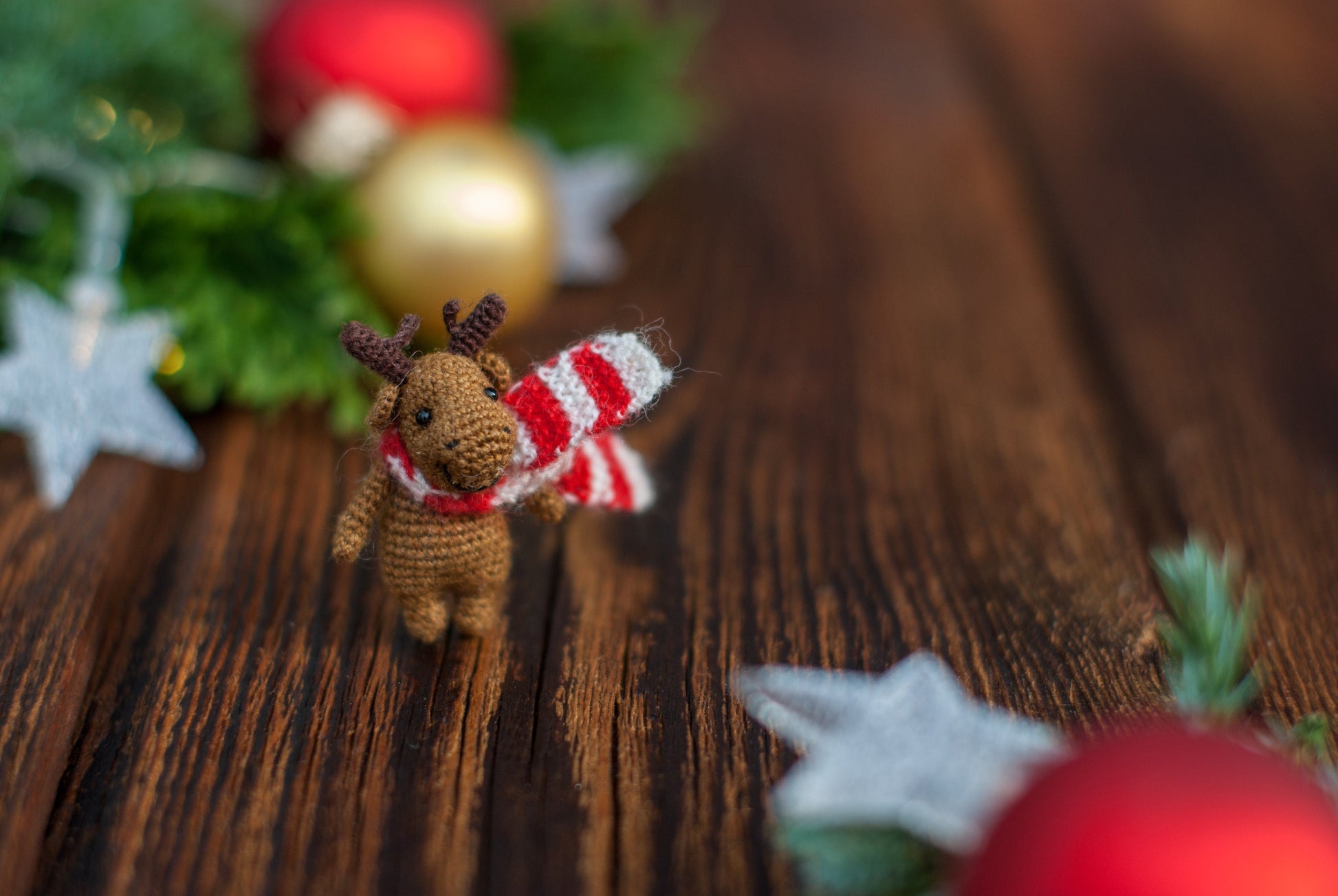 This tiny moose is bundled up in a red-and-white scarf and full of quiet joy. Hand-crocheted with love, he's the kind of friend who brings magic to mantels, dollhouses, or the palm of your hand.