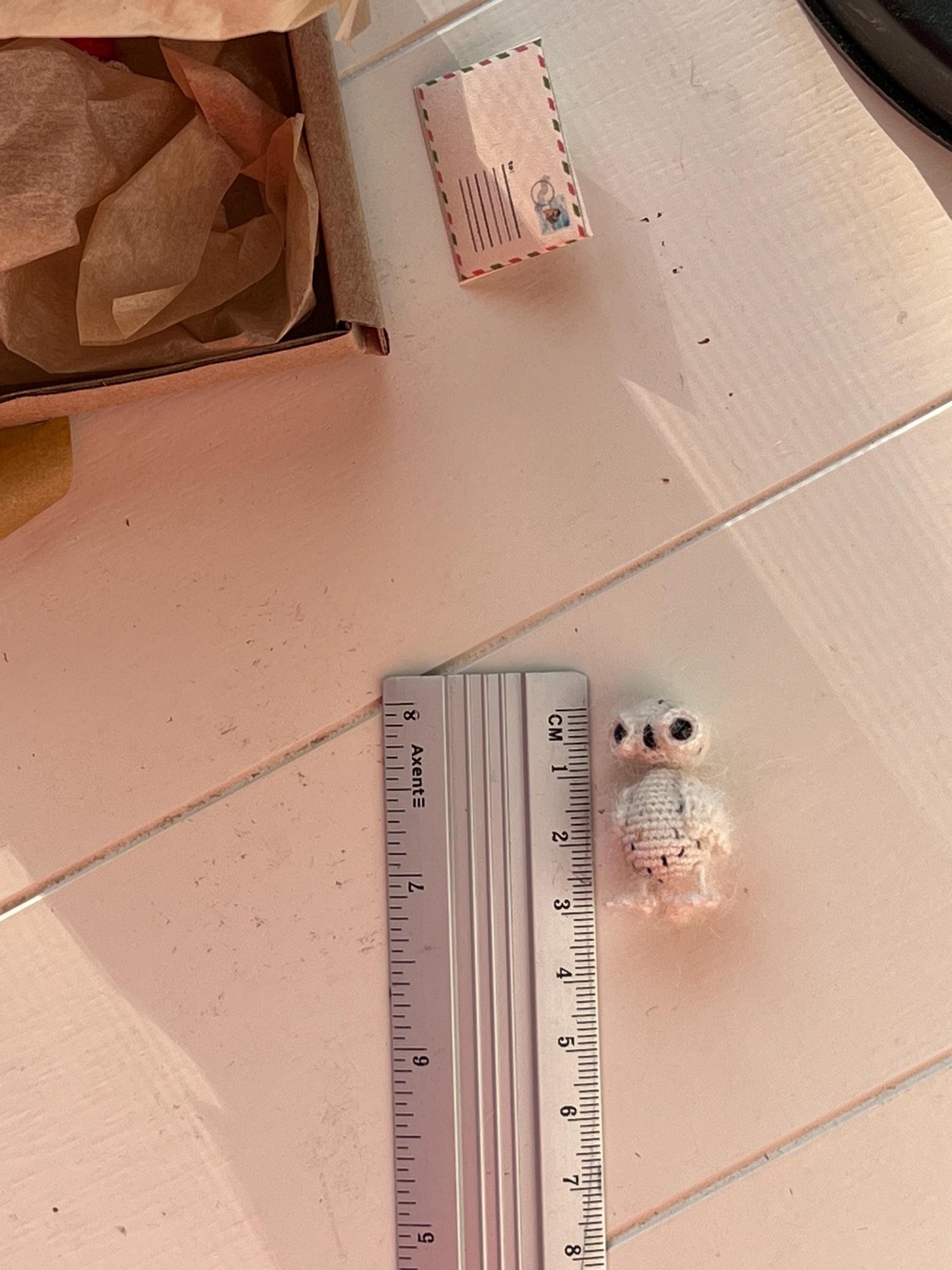 Lovingly handmade from cotton threads and mohair fluff, this miniature crochet owl is perfect for dollhouse scenes, enchanted corners, or nature-inspired collections.